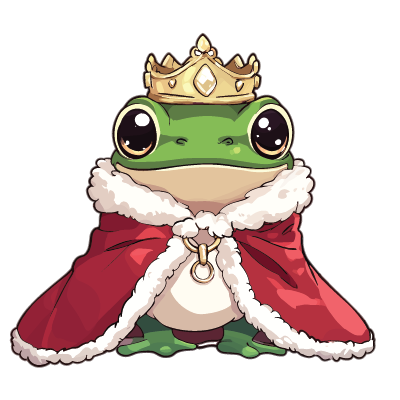 A cartoon frog wearing a golden crown and a red and white fur-lined cape