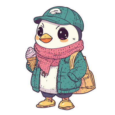 A cozy vector illustration of a stylish penguin dressed in a jacket, scarf, and cap, holding an ice cream cone and a backpack, ready for a cool adventure