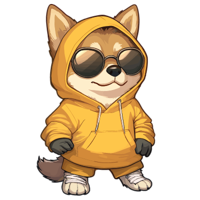 A cartoon dog wearing a yellow hoodie, sunglasses, and gloves