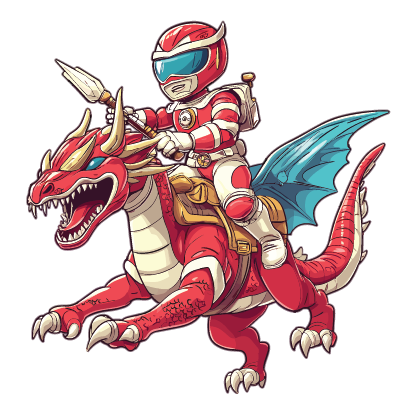 A fearless red superhero clad in iconic armor, riding atop a ferocious dragon with vibrant red scales and blue wings. The dragon exudes power with its sharp horns and teeth, while the hero holds a spear and displays a commanding pose. Together, they form an unstoppable duo ready for epic adventures!
