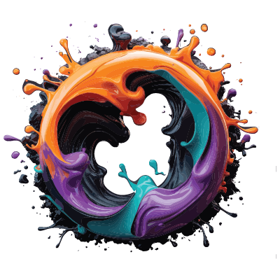 A mesmerizing abstract design of vibrant paint splashes in orange, purple, teal, and black, forming a striking circular shape against a clean background.
