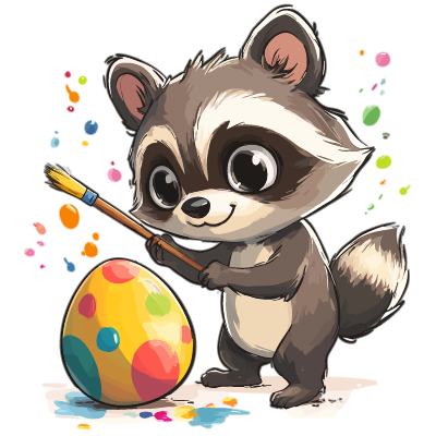 A raccoon holding a paintbrush and painting an Easter egg with colorful spots.
