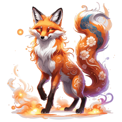 A captivating fox with intricate floral and swirling patterns adorning its fiery orange fur, glowing with a mystical aura, surrounded by soft magical flames and orbs, all set against a clean white background.