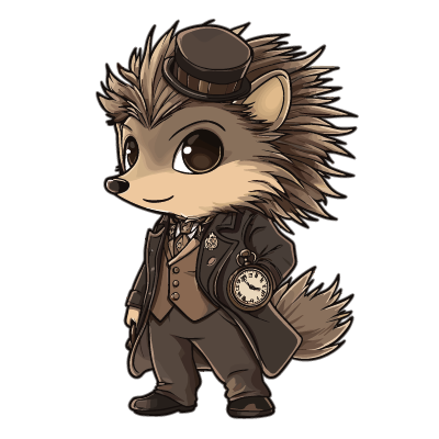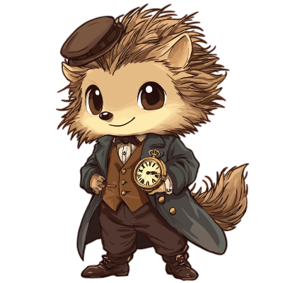 A cartoon hedgehog in Victorian-era clothing, including a brown vest, white shirt, black bow tie, brown trousers, and a dark long coat, holding a pocket watch in one hand and wearing a small round hat tilted to the side.
