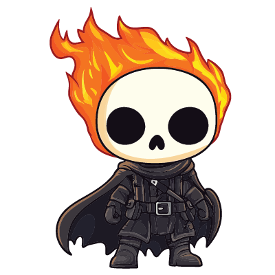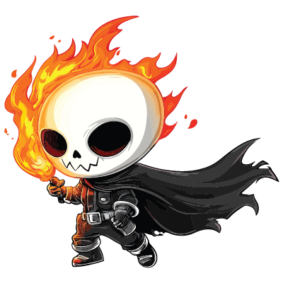 A fiery-headed specter draped in a flowing black cape, wielding a blazing flame in his hand as he strides forward with unstoppable determination.