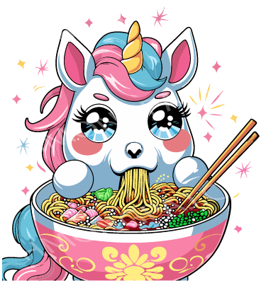 A pastel unicorn with a rainbow mane happily slurps noodles from a bowl.