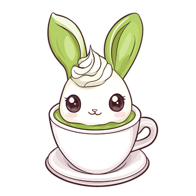 A whimsical vector illustration of a bunny-shaped dessert nestled in a cup of creamy matcha, blending cuteness with a hint of sweetness