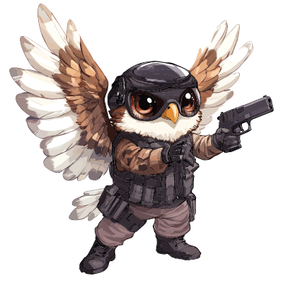 A owl dressed in tactical military gear. The owl is wearing a black helmet, goggles, and a tactical vest with various pouches.