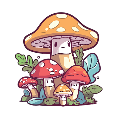 A delightful family of smiling mushrooms in various shapes and sizes, nestled among lush green leaves, showcasing a whimsical forest vibe