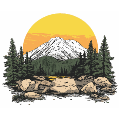 A tranquil landscape featuring a snow-capped mountain framed by pine trees, boulders, and a calm river, with a glowing yellow sun rising in the background.