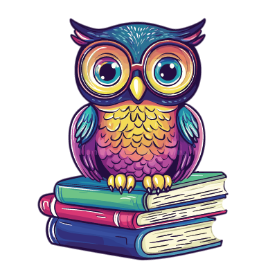 A vibrant owl with large, round glasses sits atop a stack of books, embodying wisdom and curiosity.