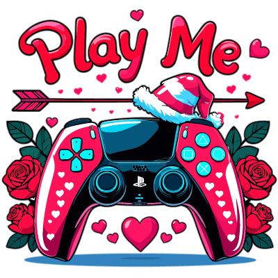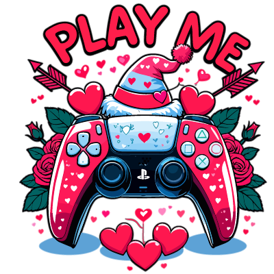 A vibrant and playful design featuring a gaming controller adorned with hearts, roses, and a festive hat, inviting love for gaming.