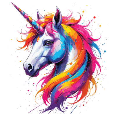 A vibrant unicorn with a colorful, flowing mane, radiating magic and wonder against a splash-paint background