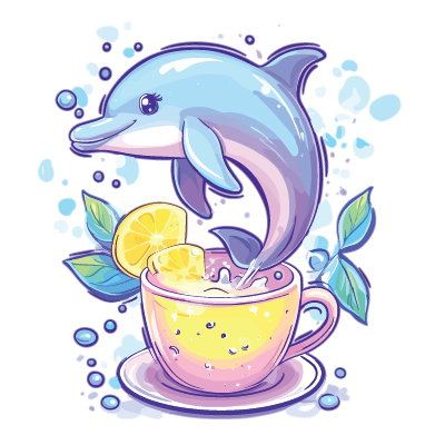 A cheerful dolphin joyfully leaping out of a vibrant pastel-colored cup filled with lemonade, surrounded by fresh lemon slices and mint leaves. Playful bubbles add a dynamic touch to this whimsical and refreshing scene