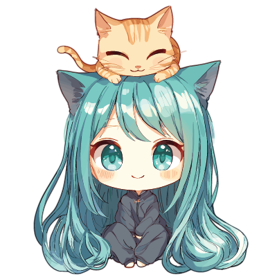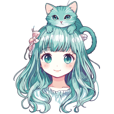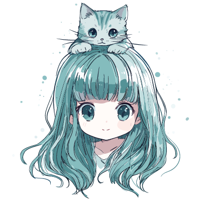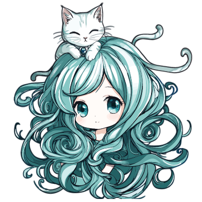 A serene white cat, adorned with a small bell around its neck, peacefully sleeps atop a mass of voluminous teal-colored hair, creating a calming and intricate visual harmony.
