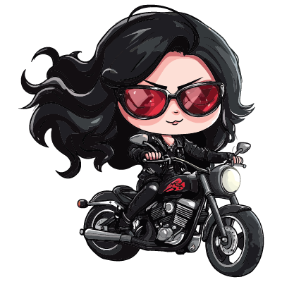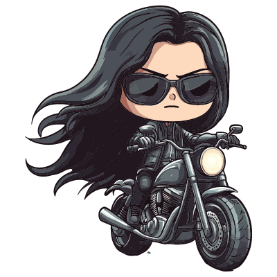 A fierce biker with flowing black hair and dark sunglasses, riding a powerful motorcycle with unstoppable determination.