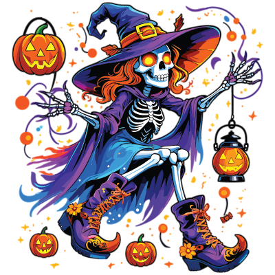 A whimsical skeleton witch dressed in a vibrant hat and flowing cloak, surrounded by glowing jack-o'-lanterns and Halloween lanterns, celebrates the spooky season in style.