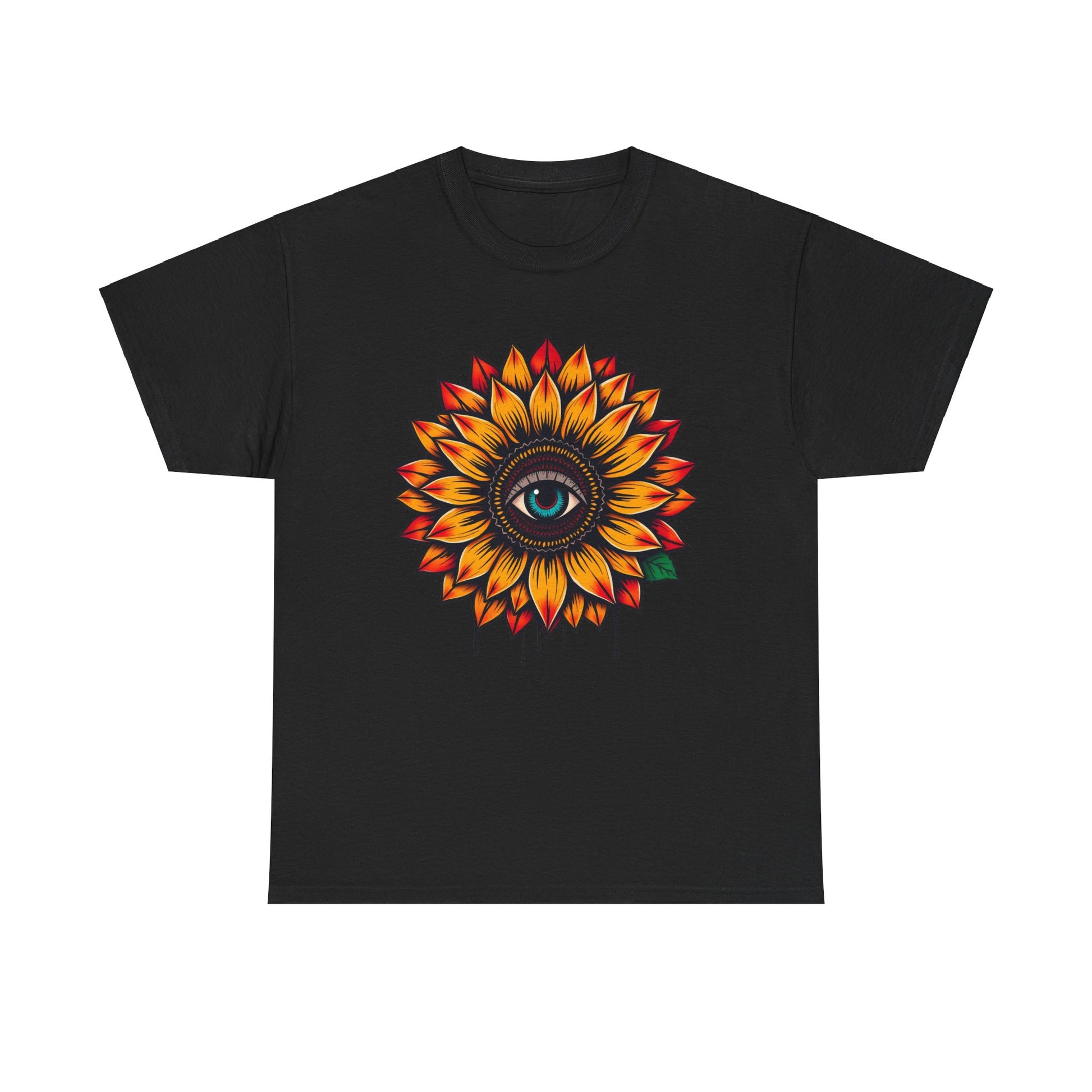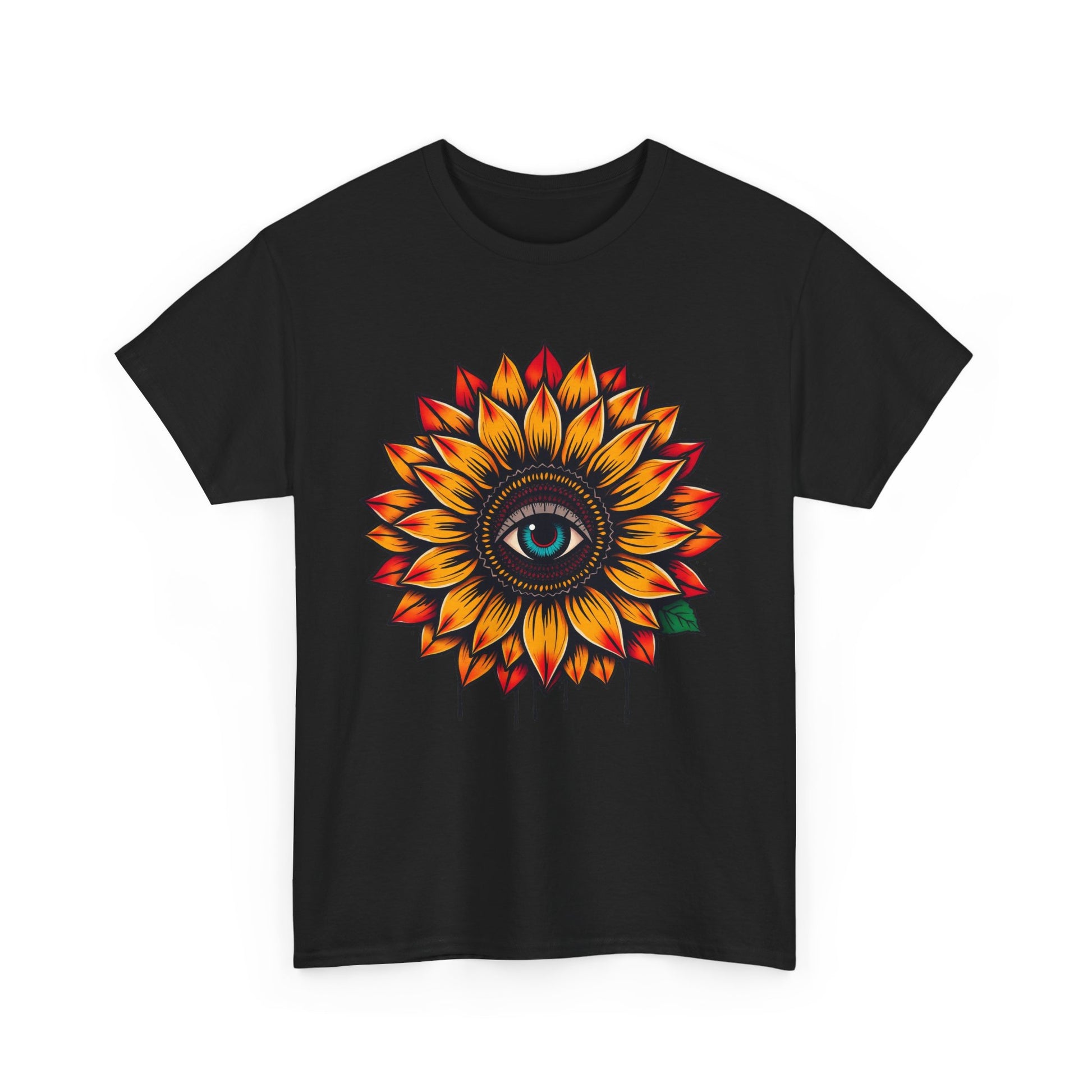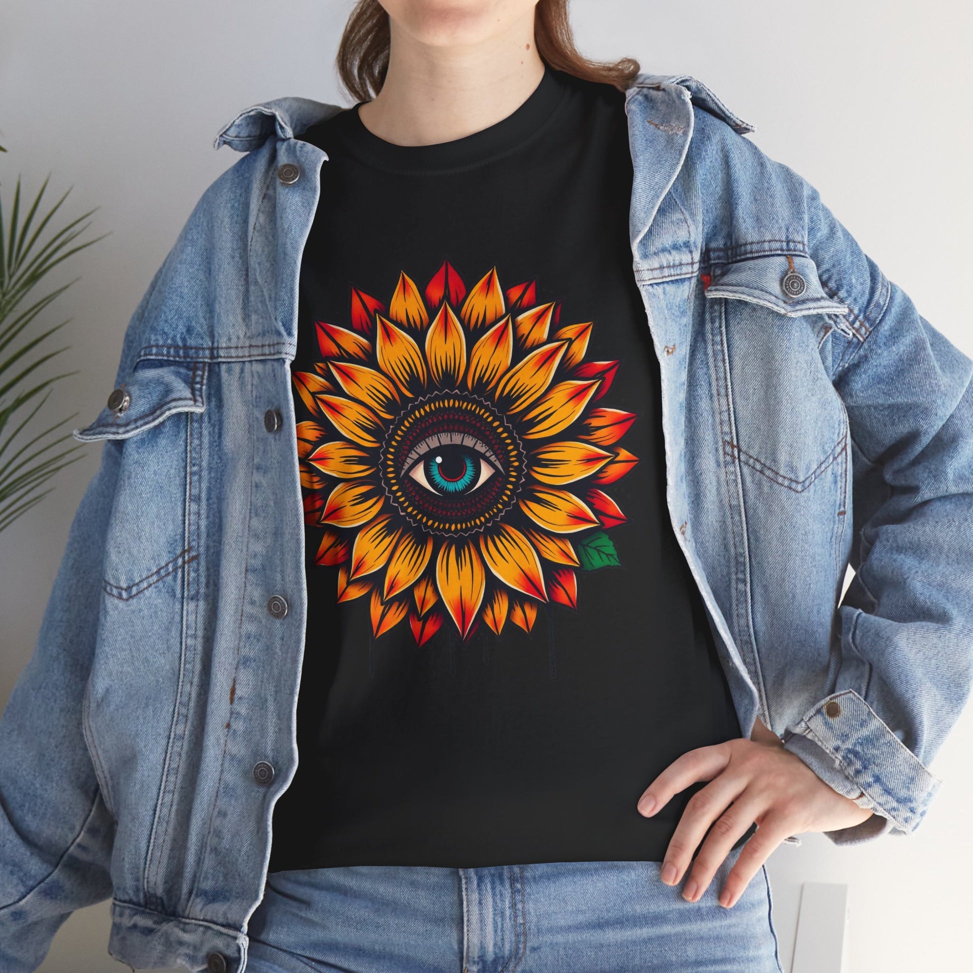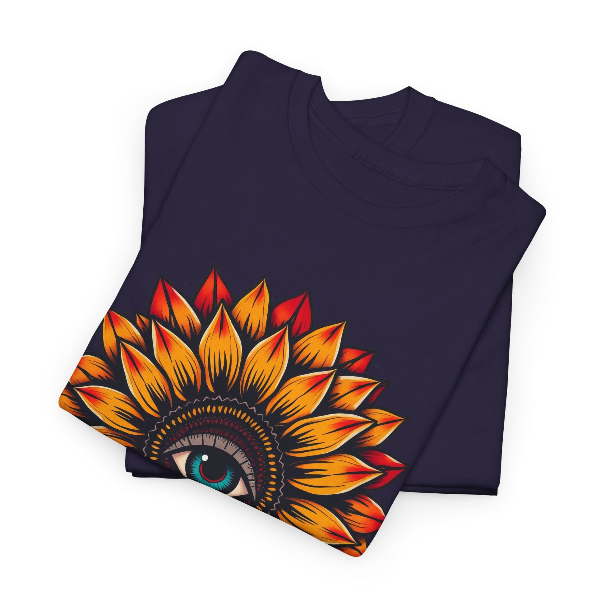 A vibrant sunflower with fiery petals encircles a mystical, watchful eye at its core, blending nature with surrealism.