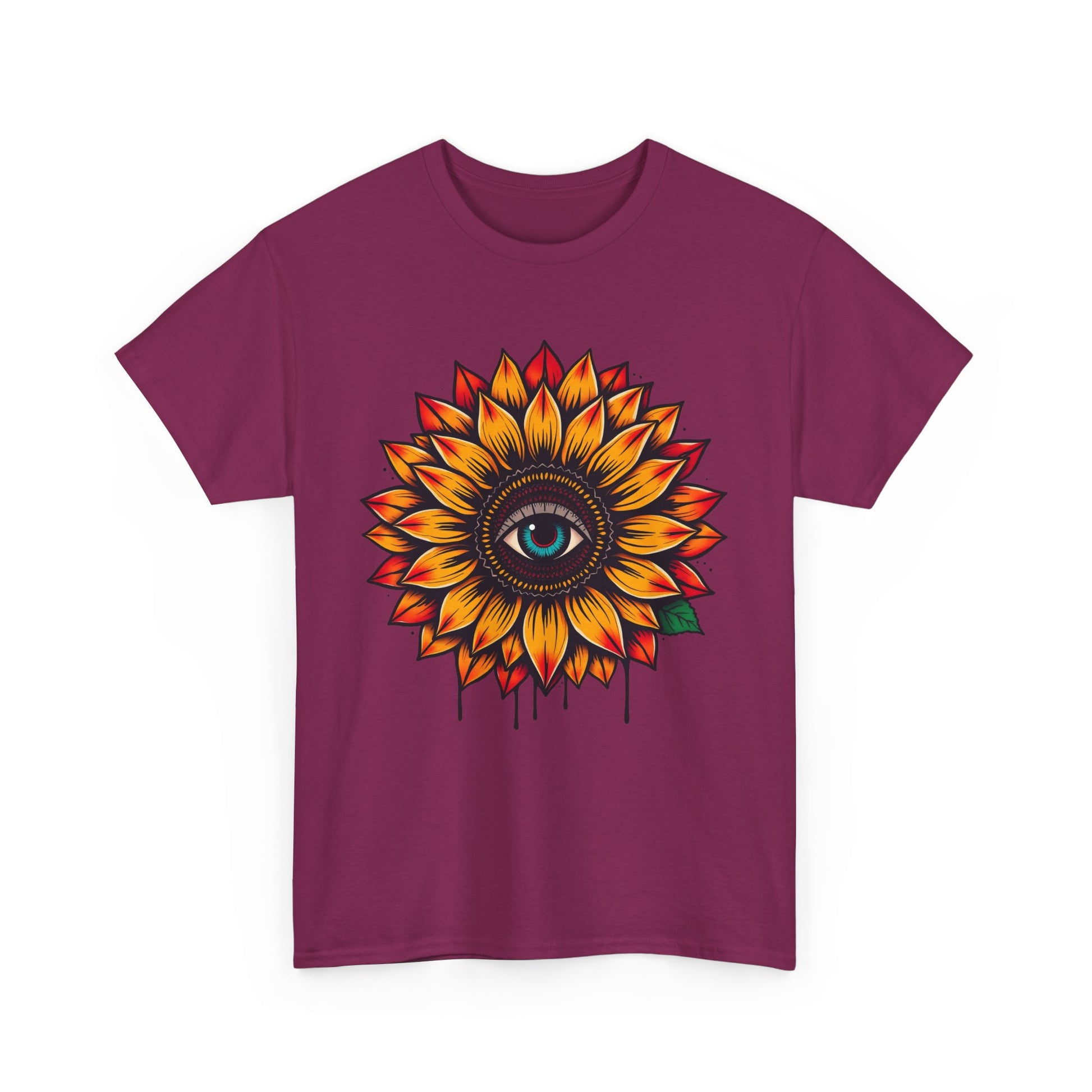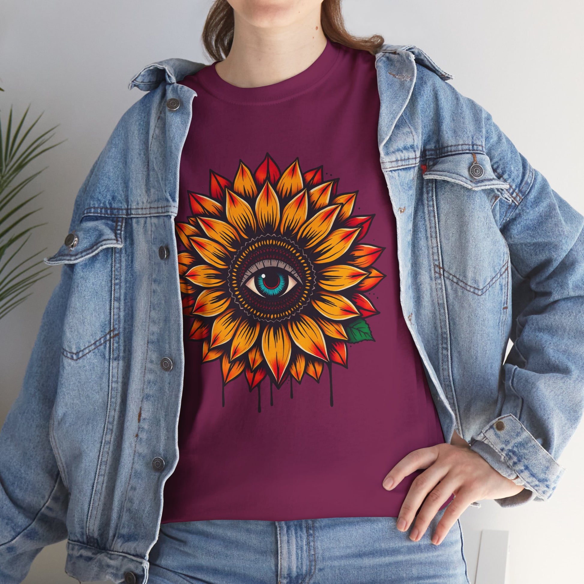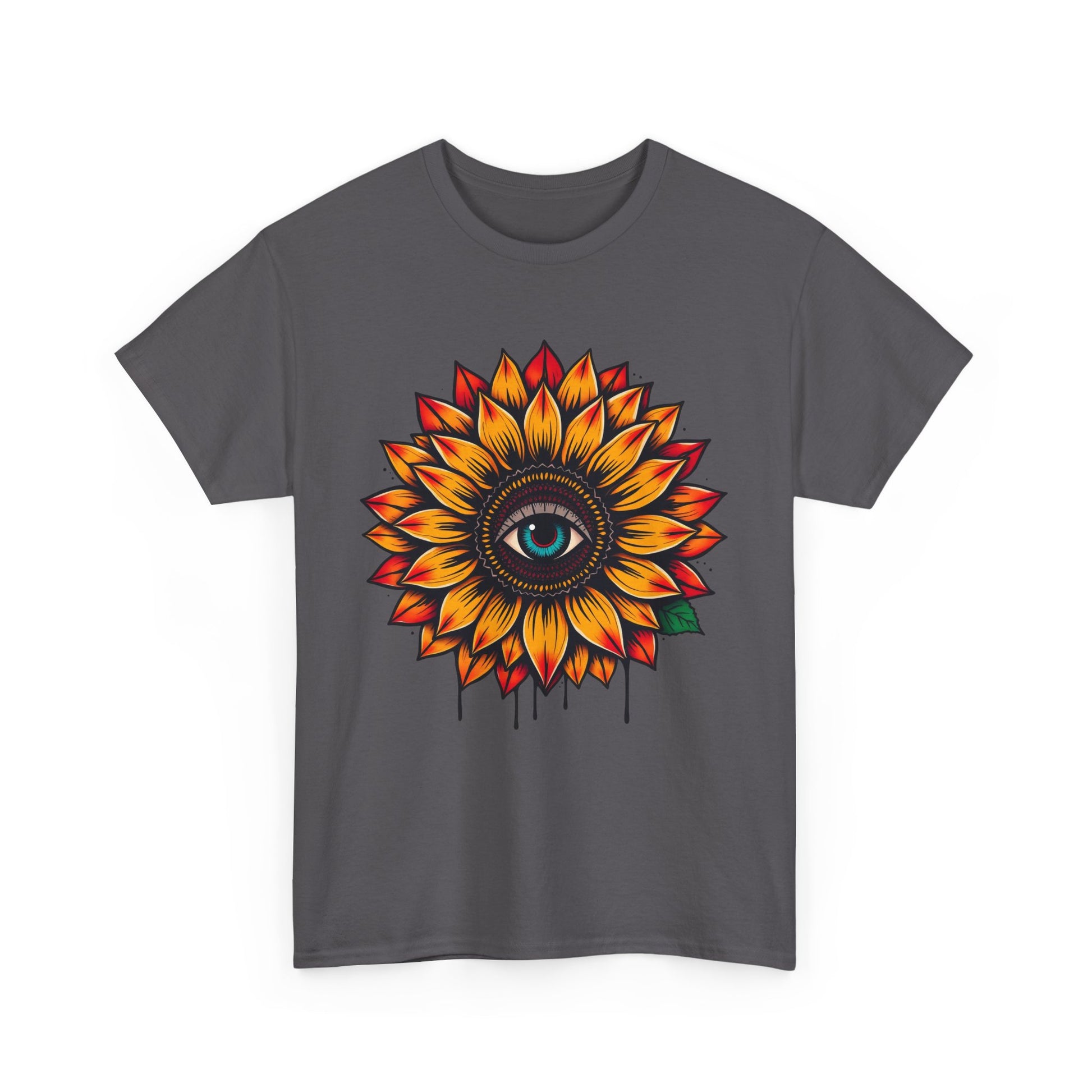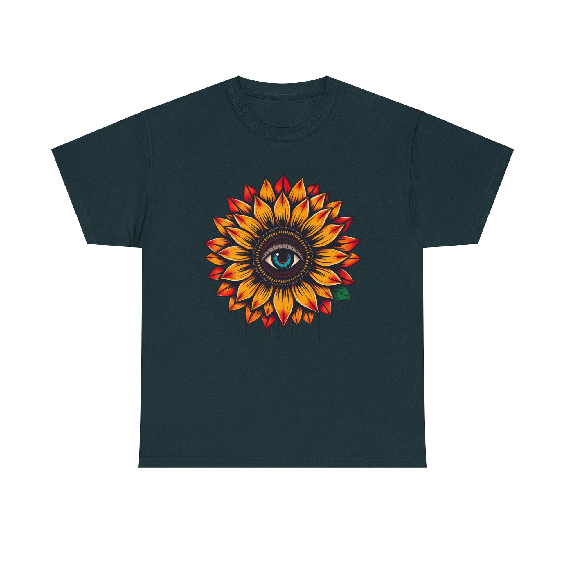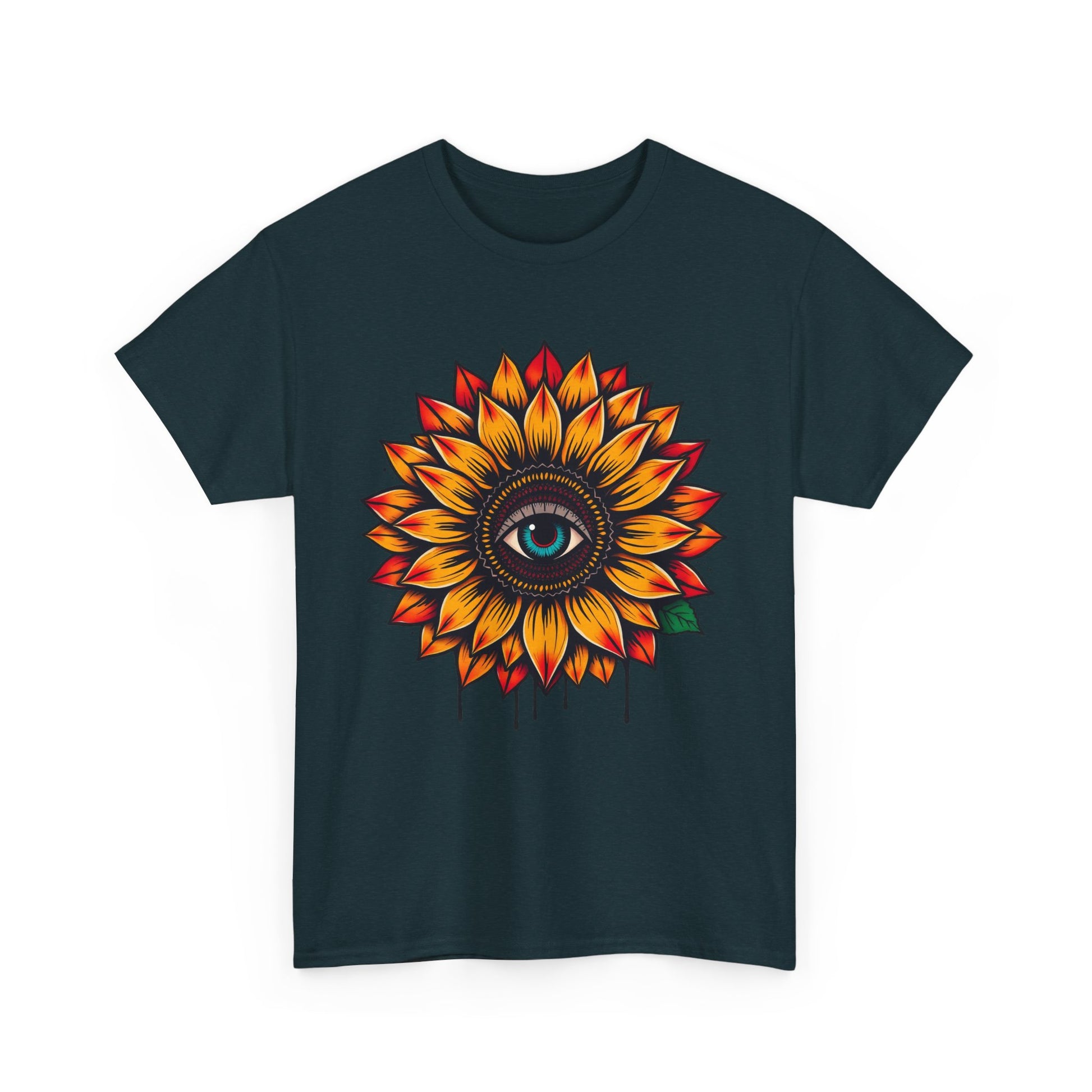 A vibrant sunflower with fiery petals encircles a mystical, watchful eye at its core, blending nature with surrealism.