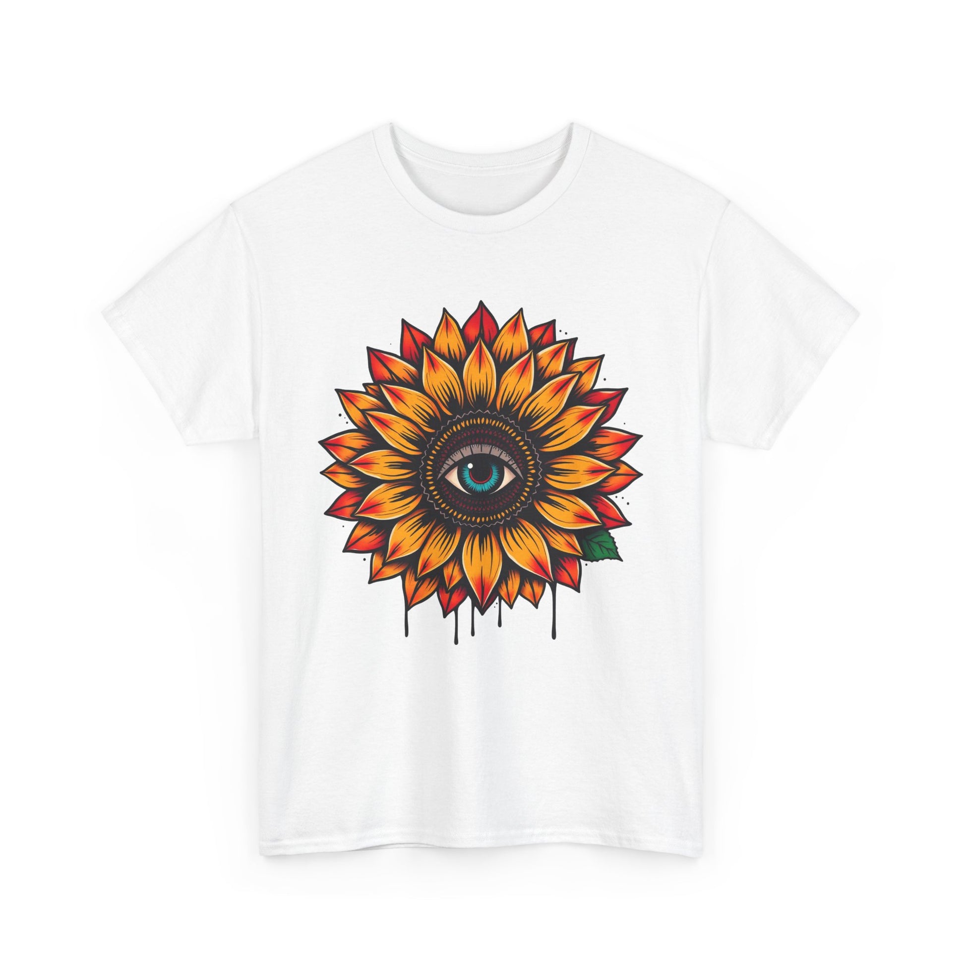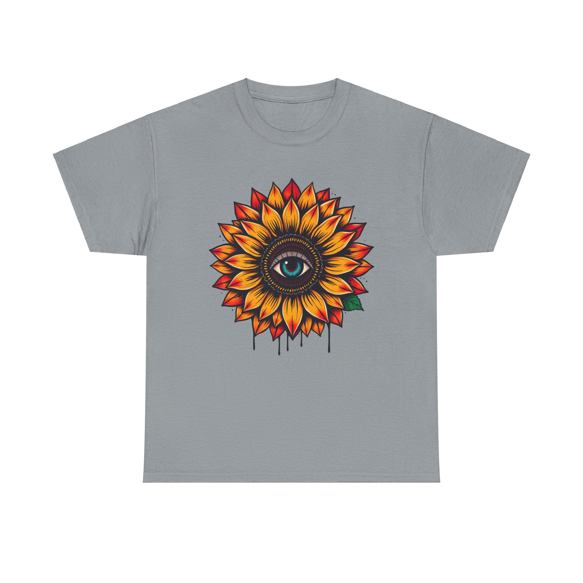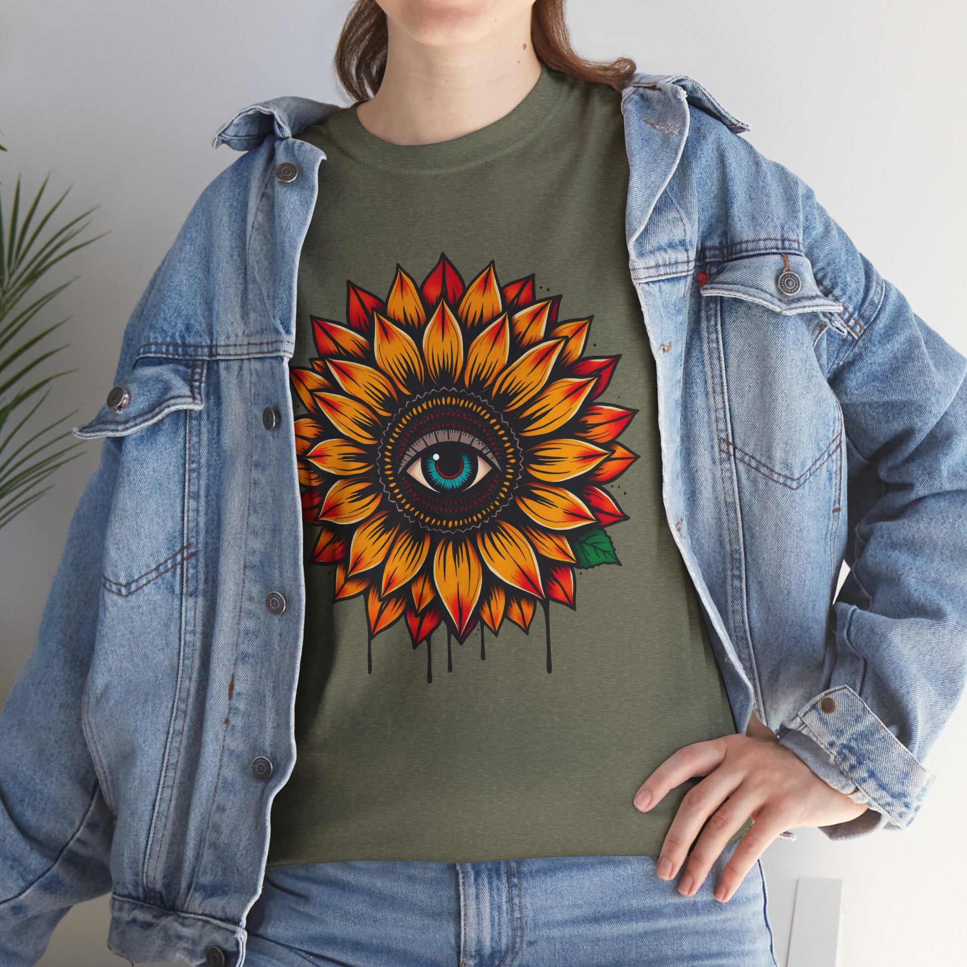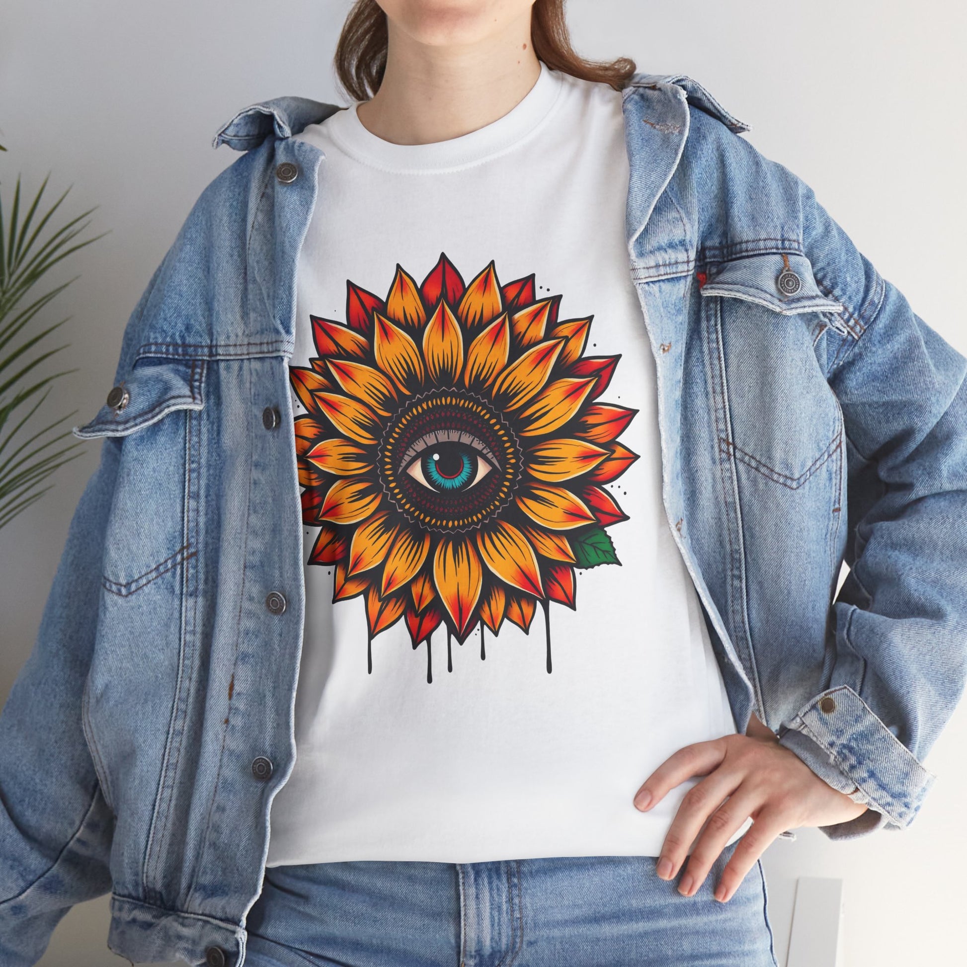 A vibrant sunflower with fiery petals encircles a mystical, watchful eye at its core, blending nature with surrealism.