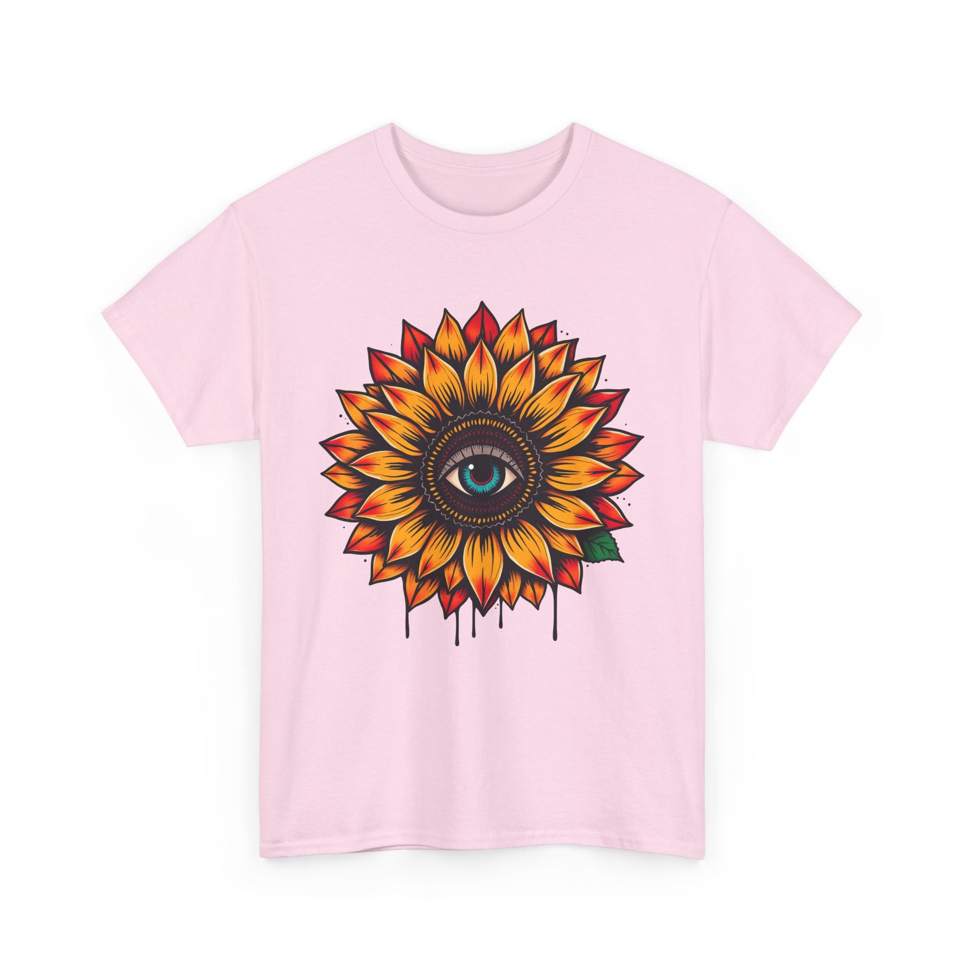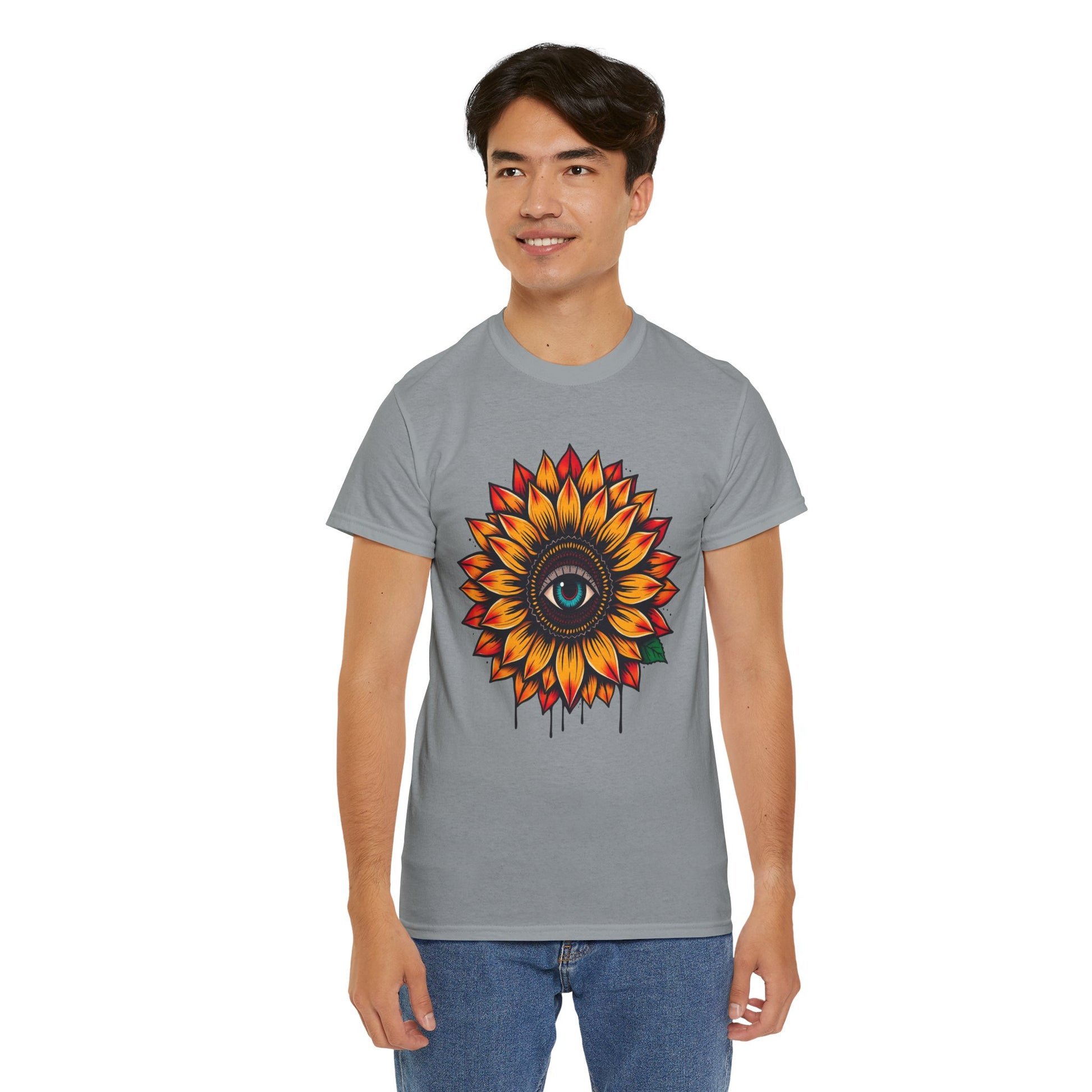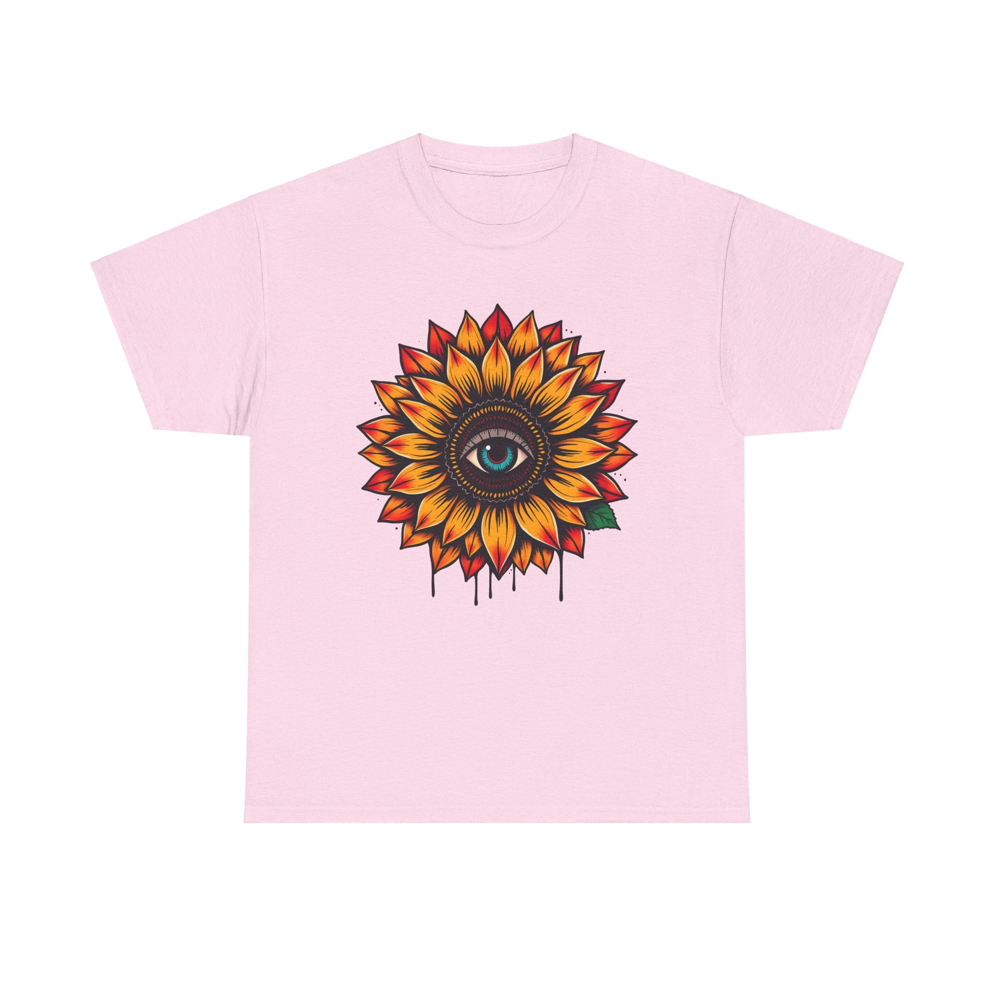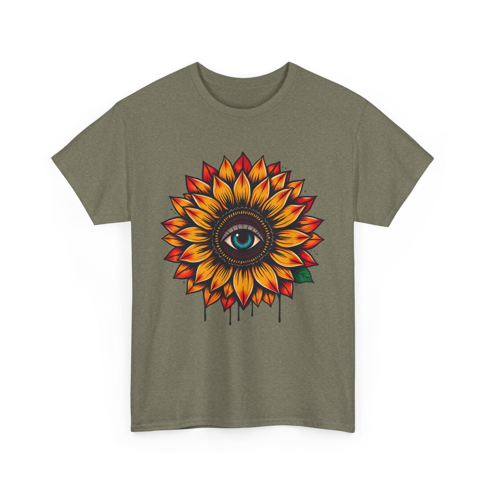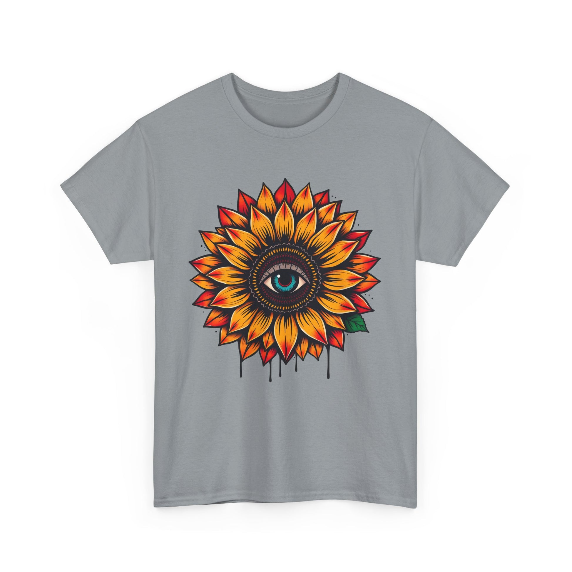 A vibrant sunflower with fiery petals encircles a mystical, watchful eye at its core, blending nature with surrealism.